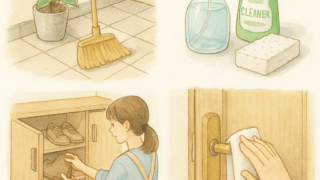 掃除術 ついで掃除で簡単キープ!玄関をきれいに保つ方法 はじめに玄関は「家の顔」とも言われる場所。そこがきれいに保たれているだけで、訪れる人に良い印象を与え、自分自身の気分もぐっと上がります。さらに、風水などでも玄関の清潔さは運気に大きな影響を与えるとされており、金運や人間関係運をアップさせたい... 掃除術