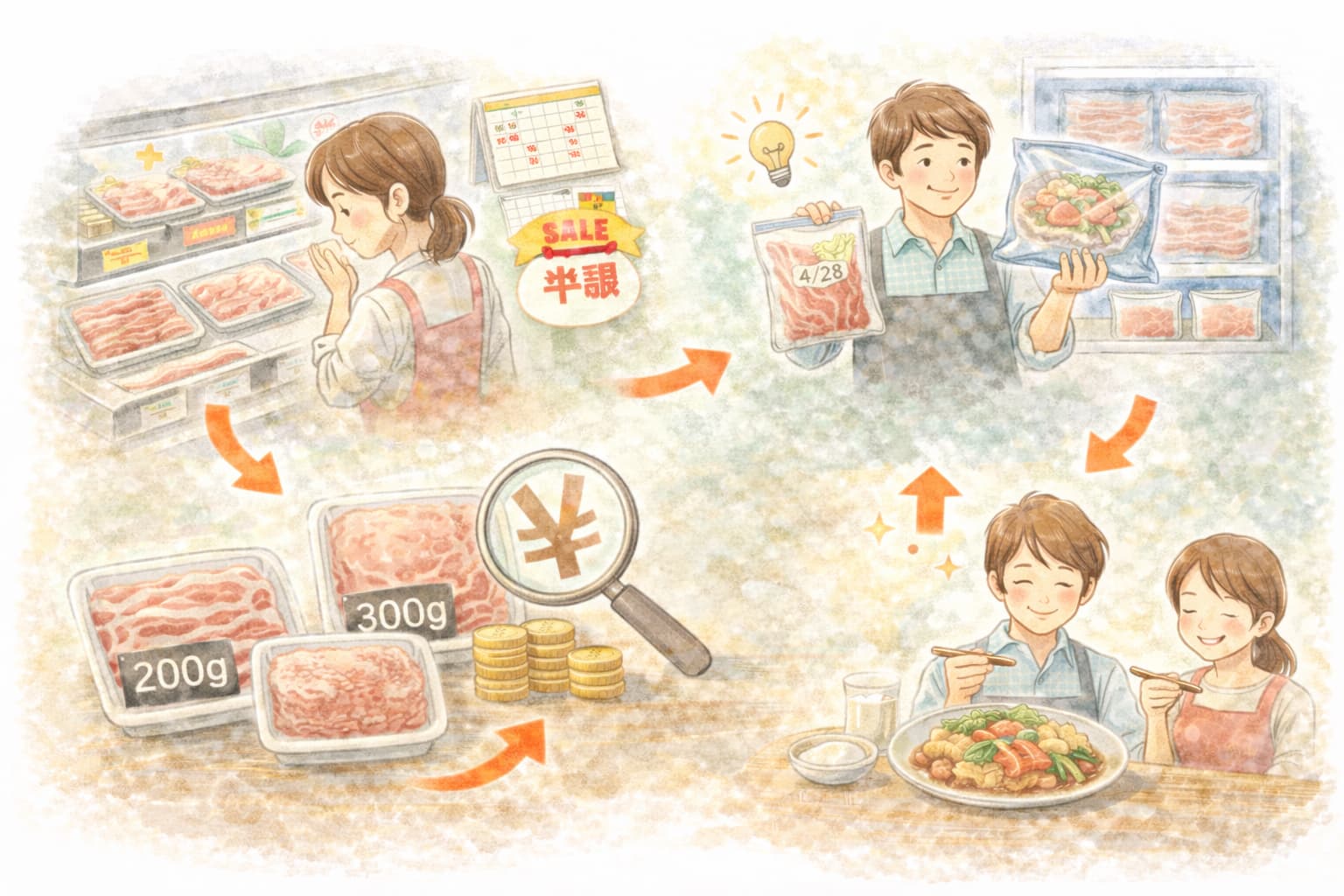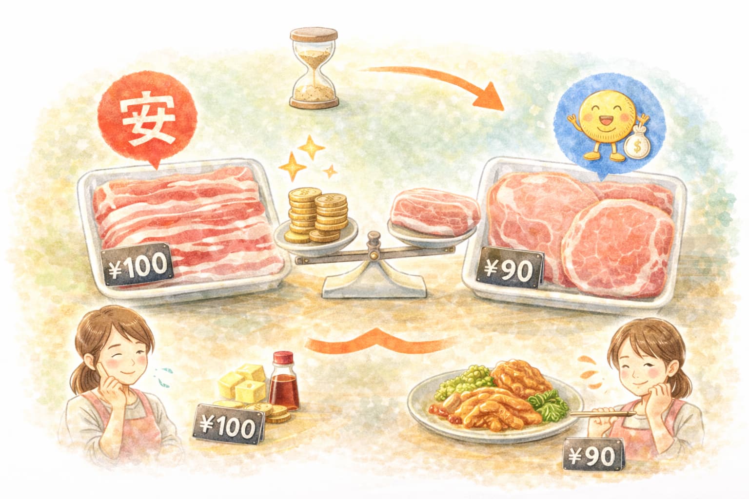 買い物ではg単価で比較しつつ、こま切れ・切り落としを活用してロスを減らすことが現実的です。