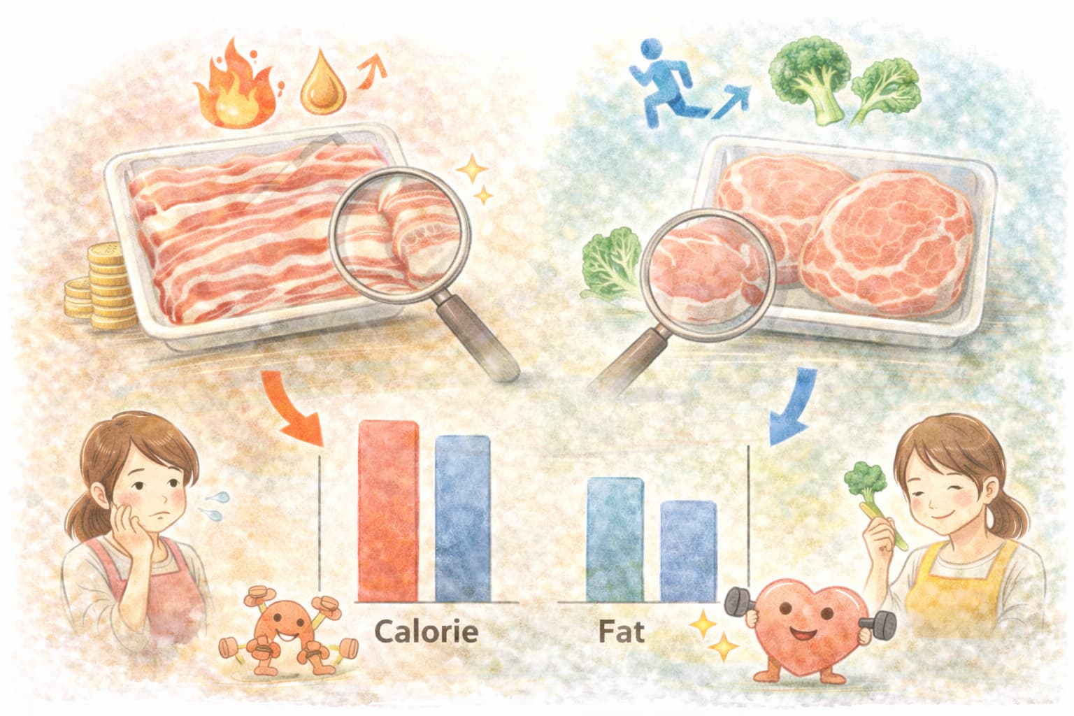 ここでは一般的な傾向として、豚バラは脂質が多く豚ロースは比較的バランスが取りやすい、という前提を押さえつつ、家庭で無理なく調整できる考え方を紹介します。