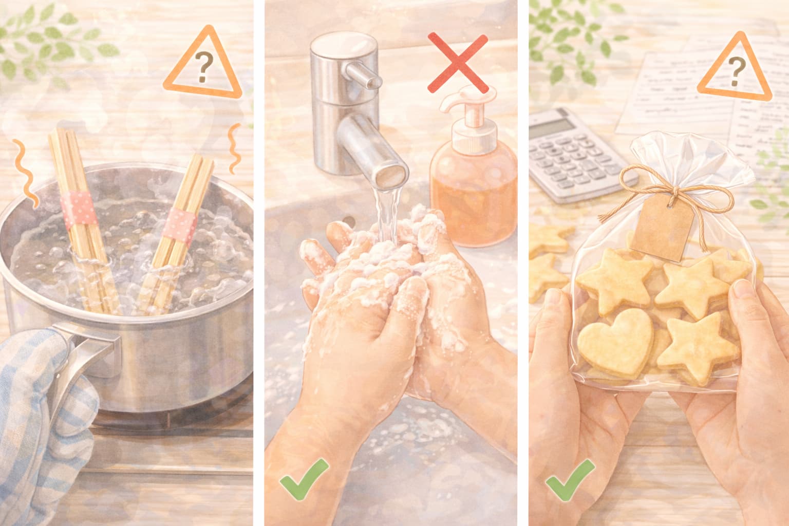 また、作業中は粉や生地が周囲に付着しやすいため、割り箸を置く場所が汚れていると、思わぬ付着物が混ざる原因になることもあります。