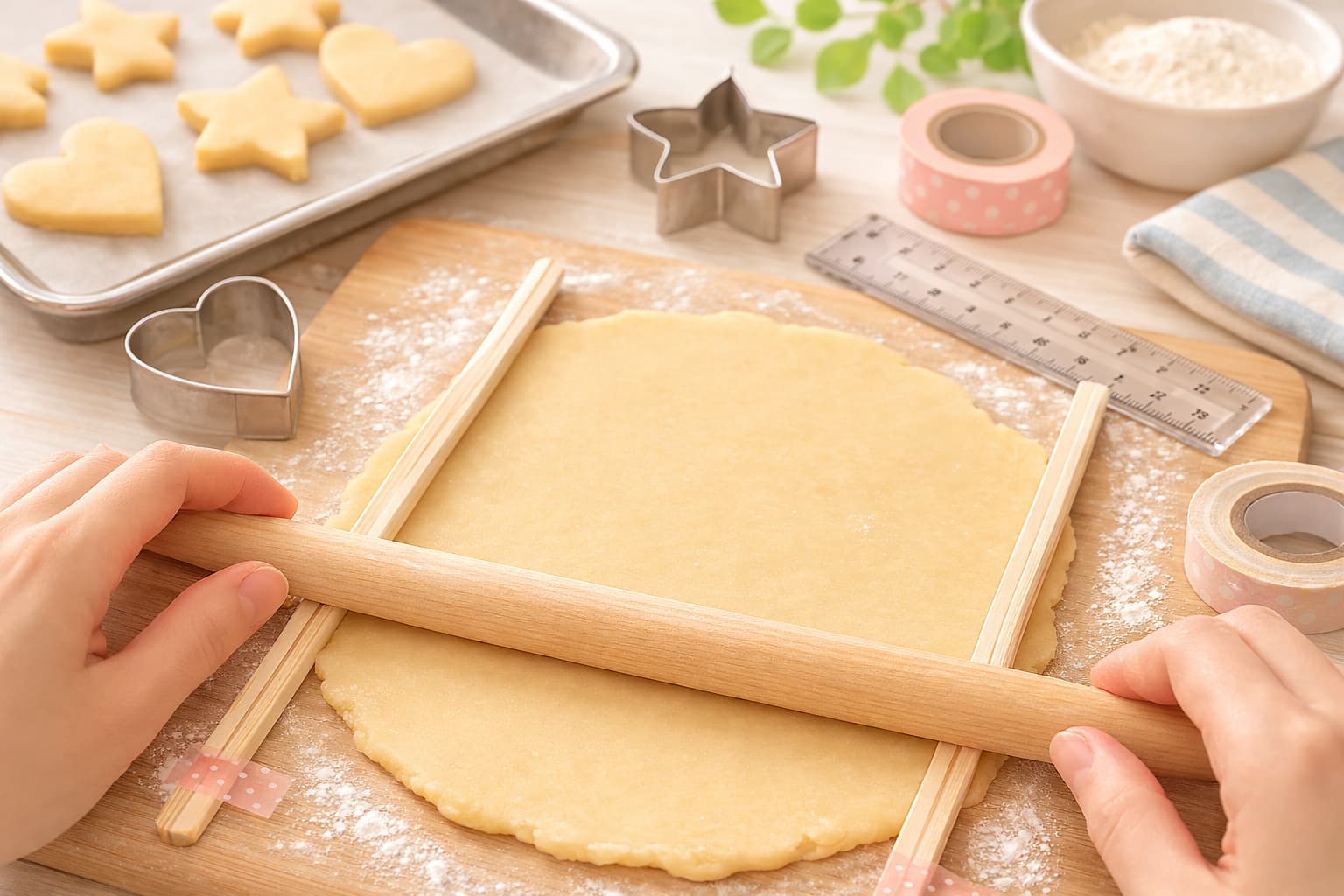クッキールーラーの役割は、めん棒を転がすときに「一定の高さ」を作り、生地の厚みを均一にすることです。