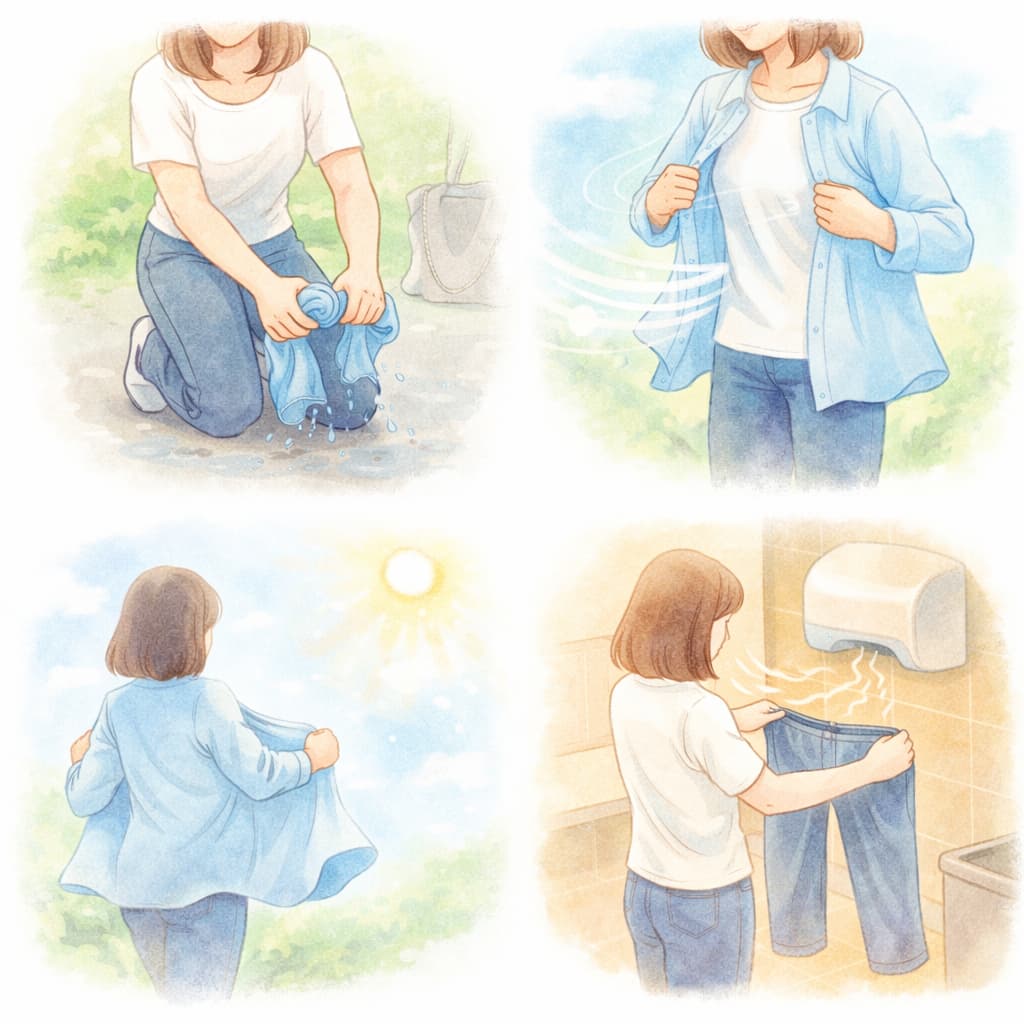 出先で濡れた服に対応する際は、「完璧に乾かす」より「短時間で不快感を減らす」ことを優先するのが現実的です。