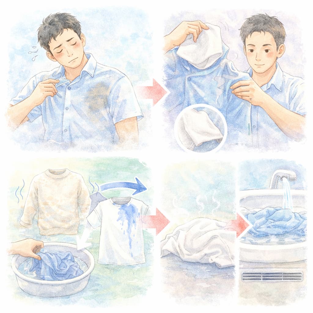 出先で服が濡れてしまったとき、最も重要なのは「順番」です。