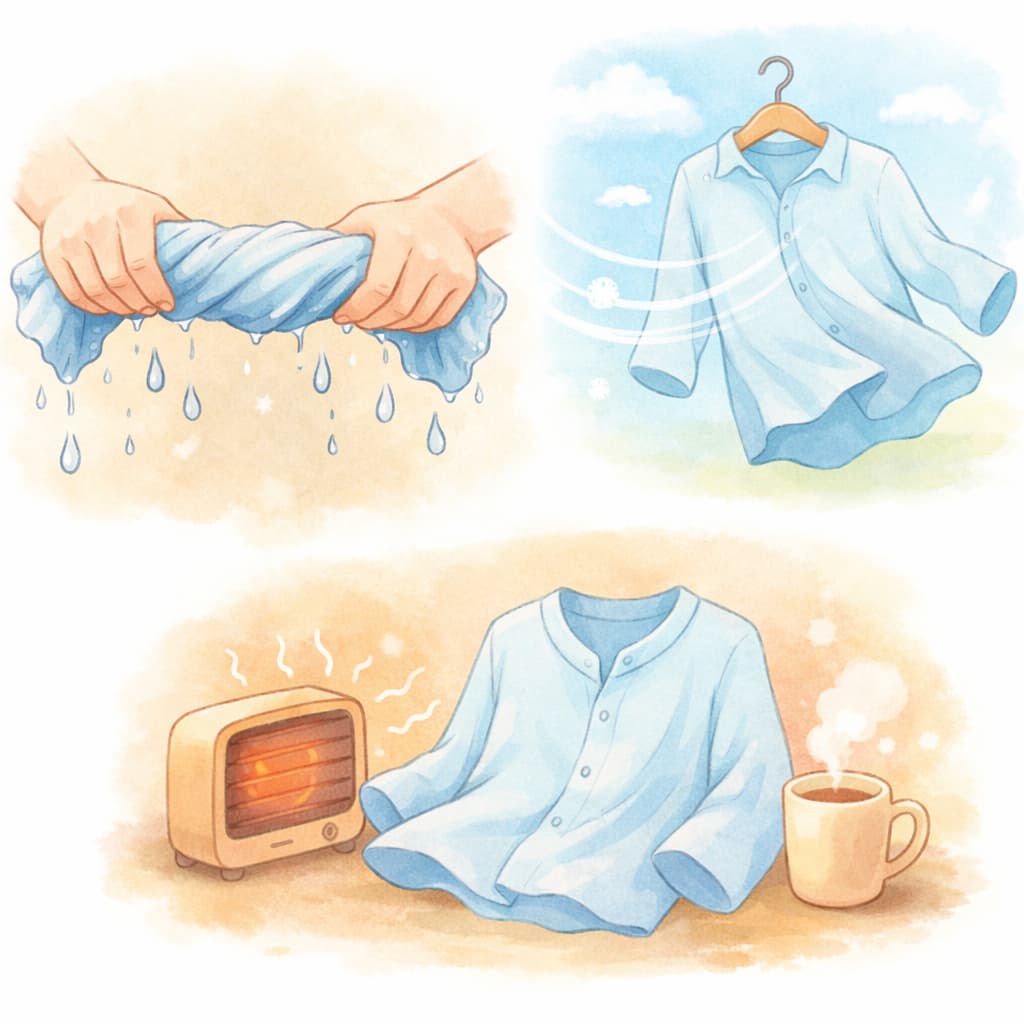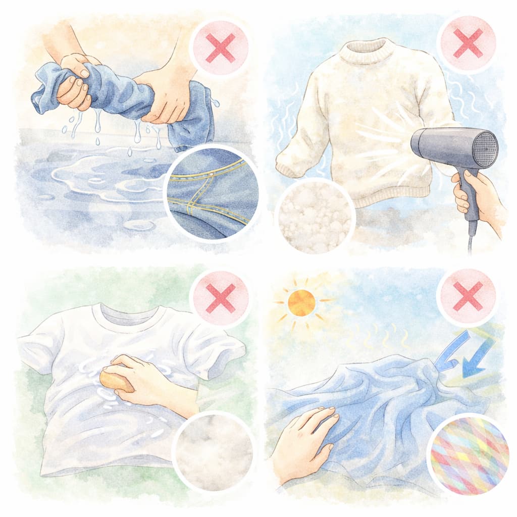 強くねじる、過度に加熱する、重ねたまま放置するなどの行動は、乾燥を遅らせるだけでなく生地を傷める原因になります。
