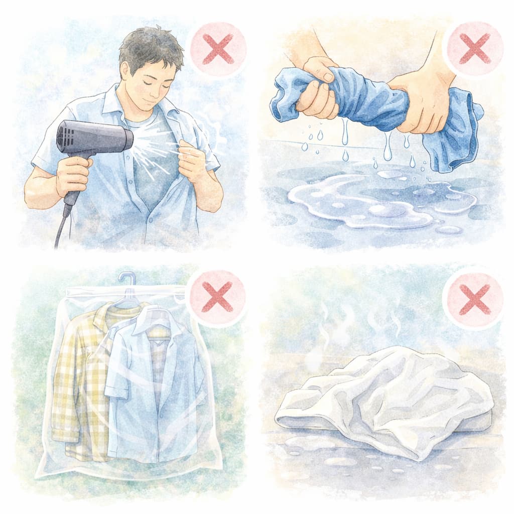 濡れた服を早く乾かしたい場面では、つい強引な方法を試してしまいがちですが、誤った行動は乾燥効率を下げるだけでなく、生地の劣化や不快感の増加につながることがあります。