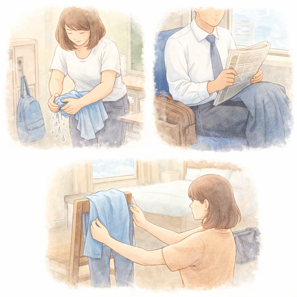 外出先で濡れた服を乾かす際は、限られた条件の中で「できることを組み合わせる」発想が重要です。