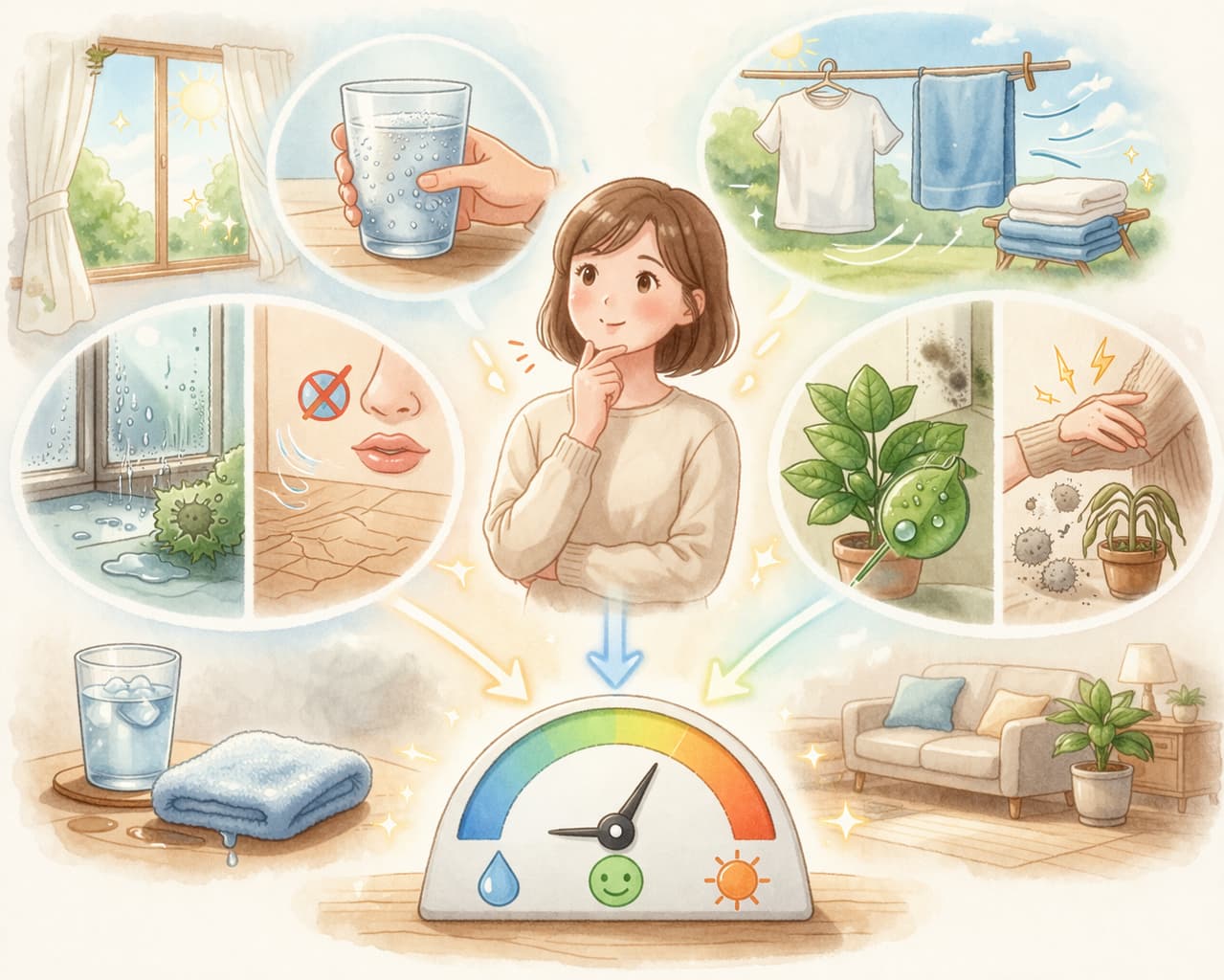 一方で、体感や肌の状態、植物の変化などは個人差や別要因の影響を受けやすく、湿度だけで判断しにくいことがあります。