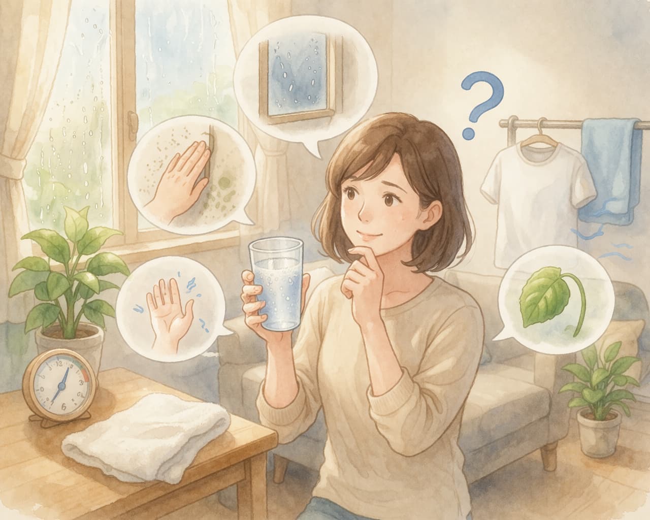 そのため、体感はひとつの参考として使いながら、窓のくもり、タオルの乾きやすさ、静電気、植物や家具まわりの様子など、目に見える変化とあわせて確認することが大切です。