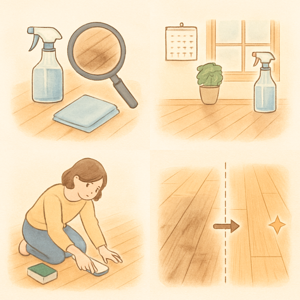 市販のフローリング用クリーナーやメラミンスポンジを使う場合も、まず目立たない場所で試すのが安心です。