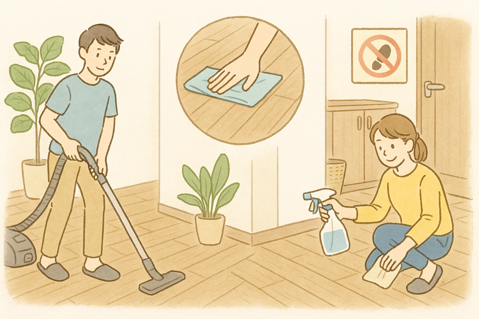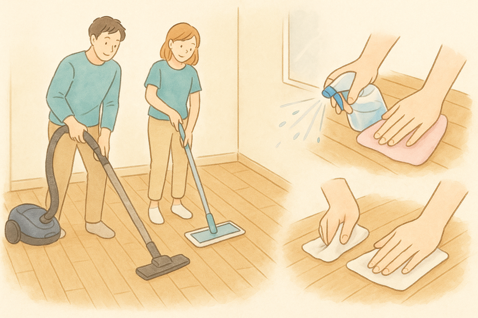 その後、水拭きで洗剤分を取り除き、最後に乾いた布で乾拭きすることで、床材を傷めず清潔な状態に保てます。