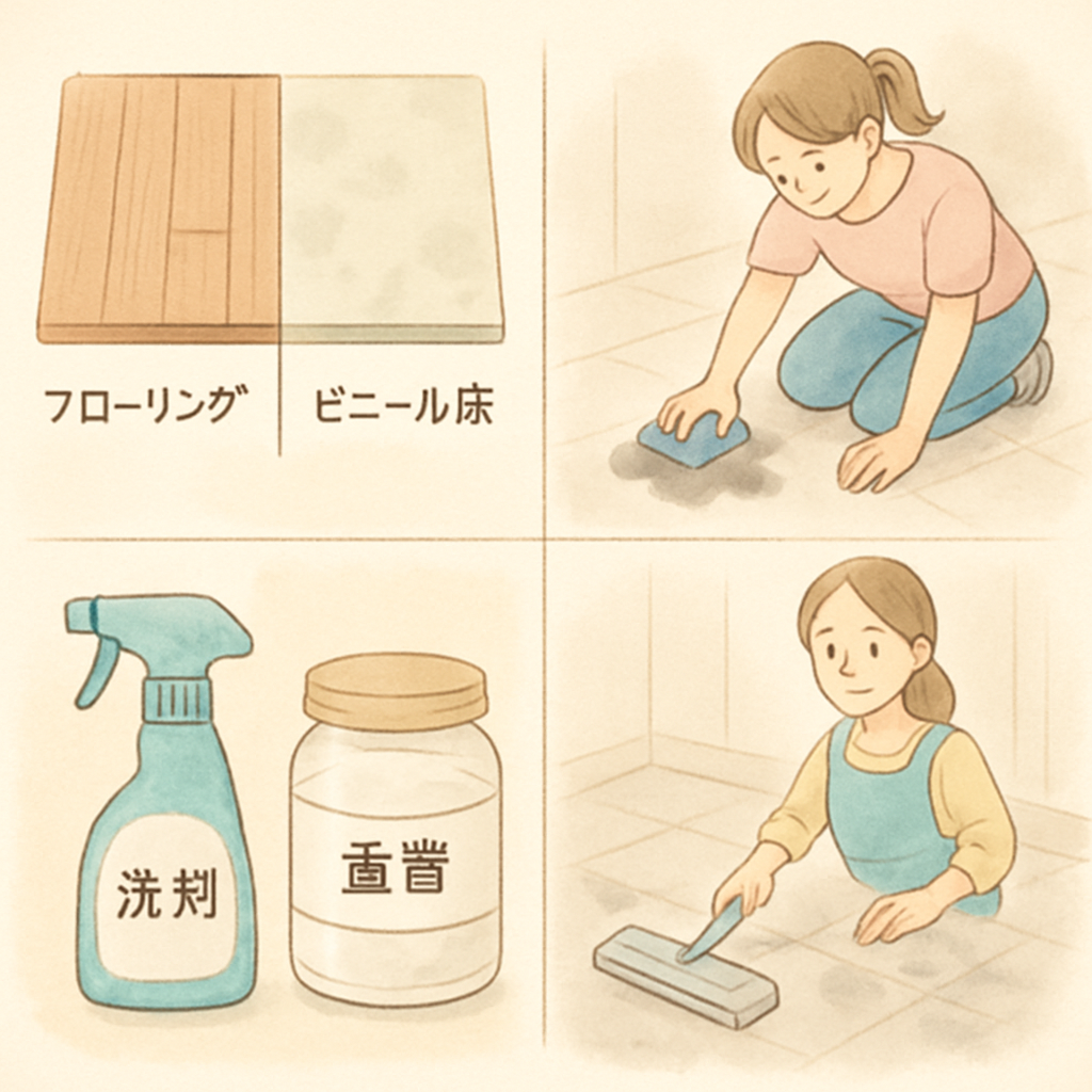 ここでは、ビニール床とフローリングの違いを踏まえた上で、黒ずみの原因や効果的な落とし方について詳しく解説します。