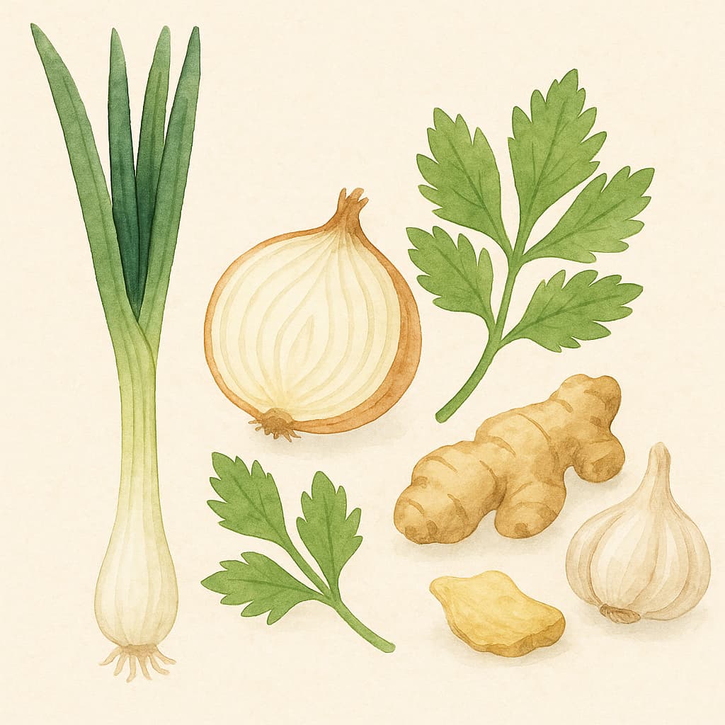 ネギの代用品を使うときは、香味野菜を複数組み合わせることで香りに奥行きを出すことができます。