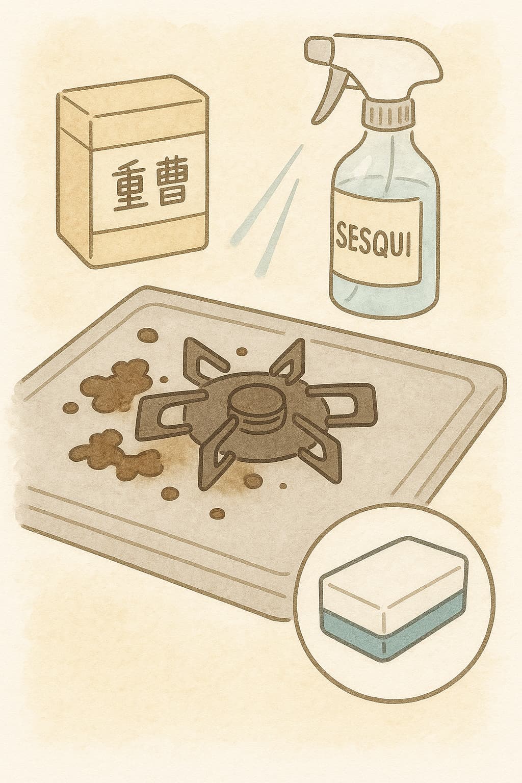 五徳は取り外してから、重曹やセスキを溶かしたお湯に漬け込むことで、こびりついた汚れを浮かせることができます。