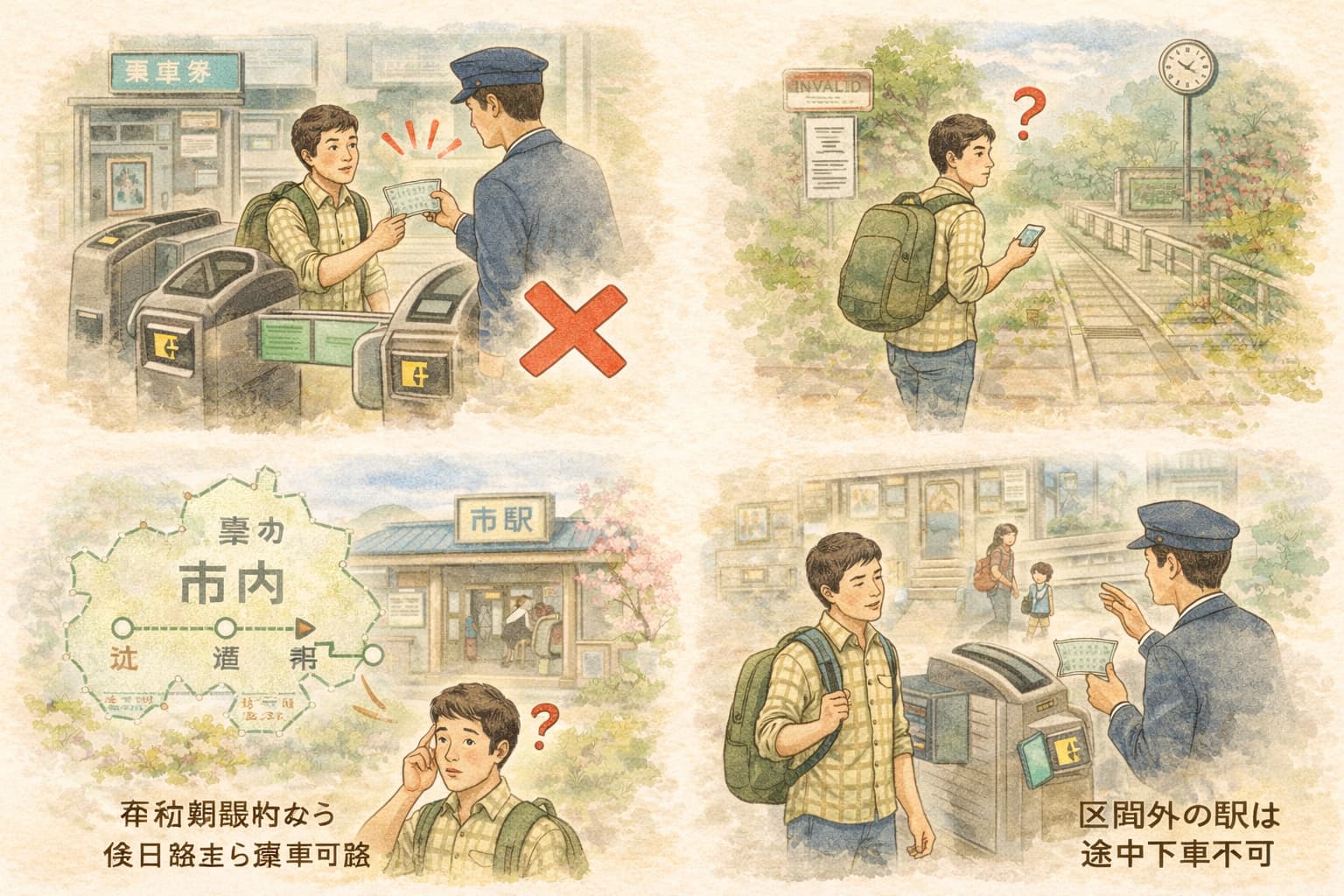 これらは途中下車や別駅乗車が制限されている場合が多く、通常の片道乗車券と同じ感覚で使うと無効になることがあります。