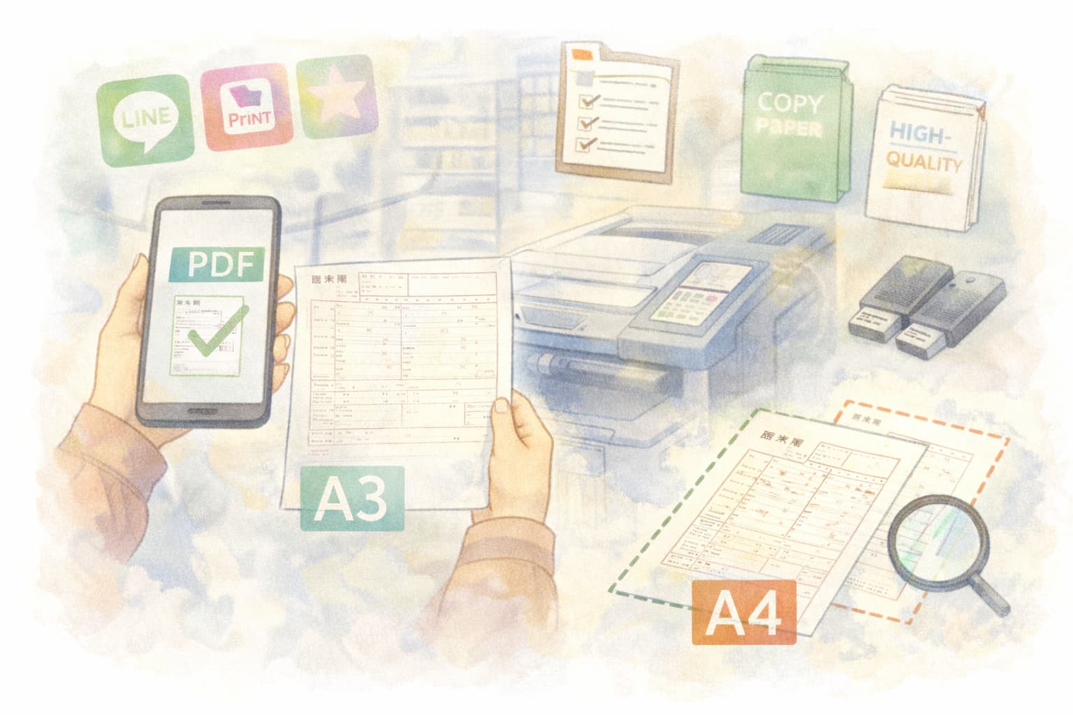店舗によってはA3用紙が補充されていない場合もあるため、印刷前に「A3対応かどうか」を確認しておくと安心です。