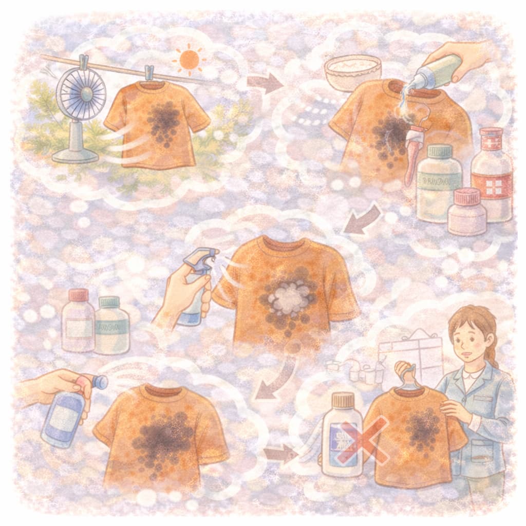 この場合も、まずは換気と拭き取りを優先し、他の衣類と接触しないよう隔離することが基本です。