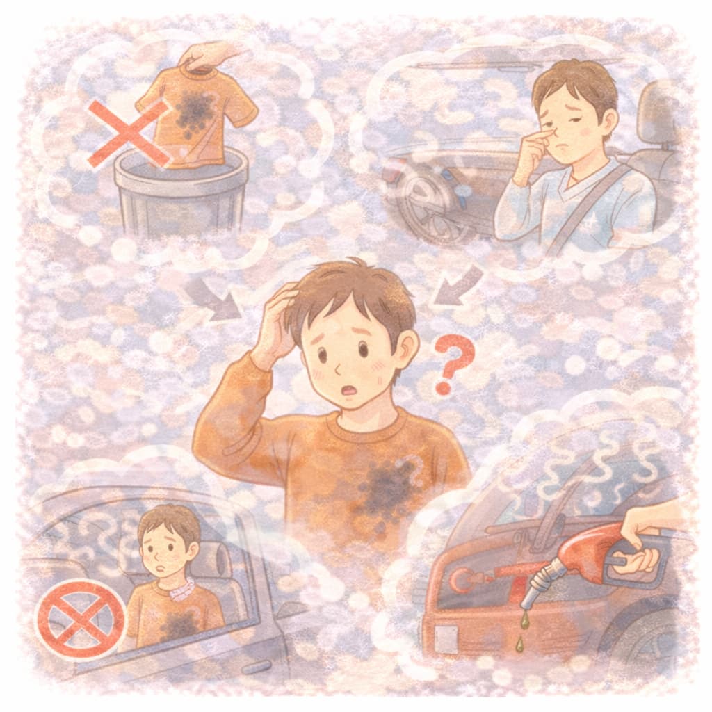 ガソリン臭が残った衣類は、周囲の人に不快感を与えたり、室内や車内に臭いが移る原因になります。