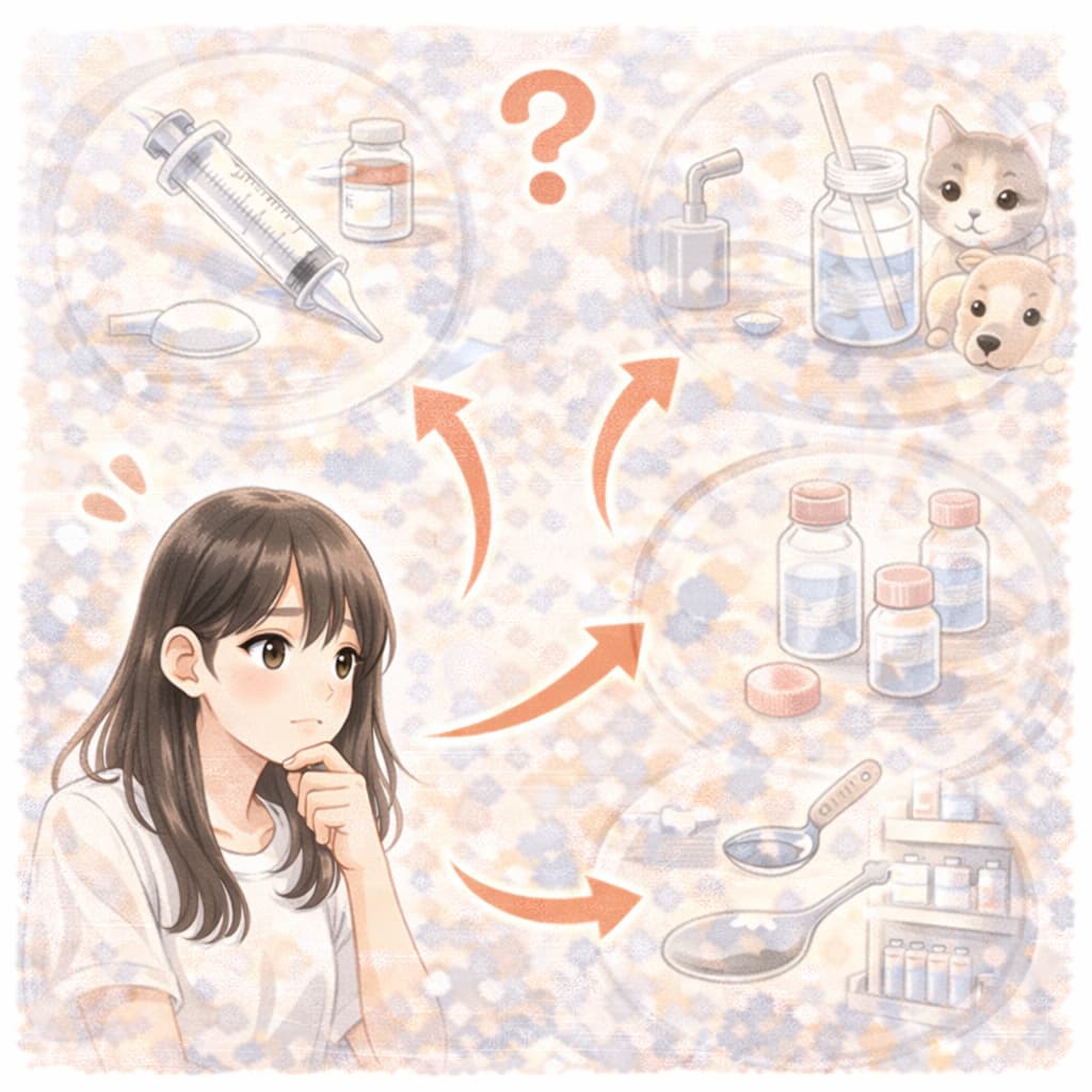 ペットに薬やシロップを与える場合は、誤飲や誤操作を防ぐことが最優先です。