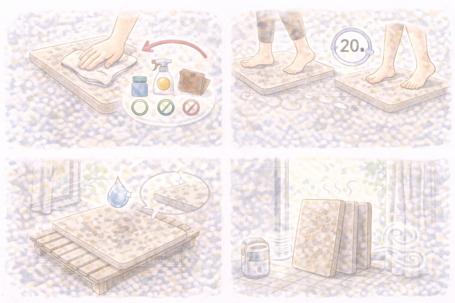 珪藻土マットは日々の使い方次第で、吸水性や清潔さを長く保つことができます。