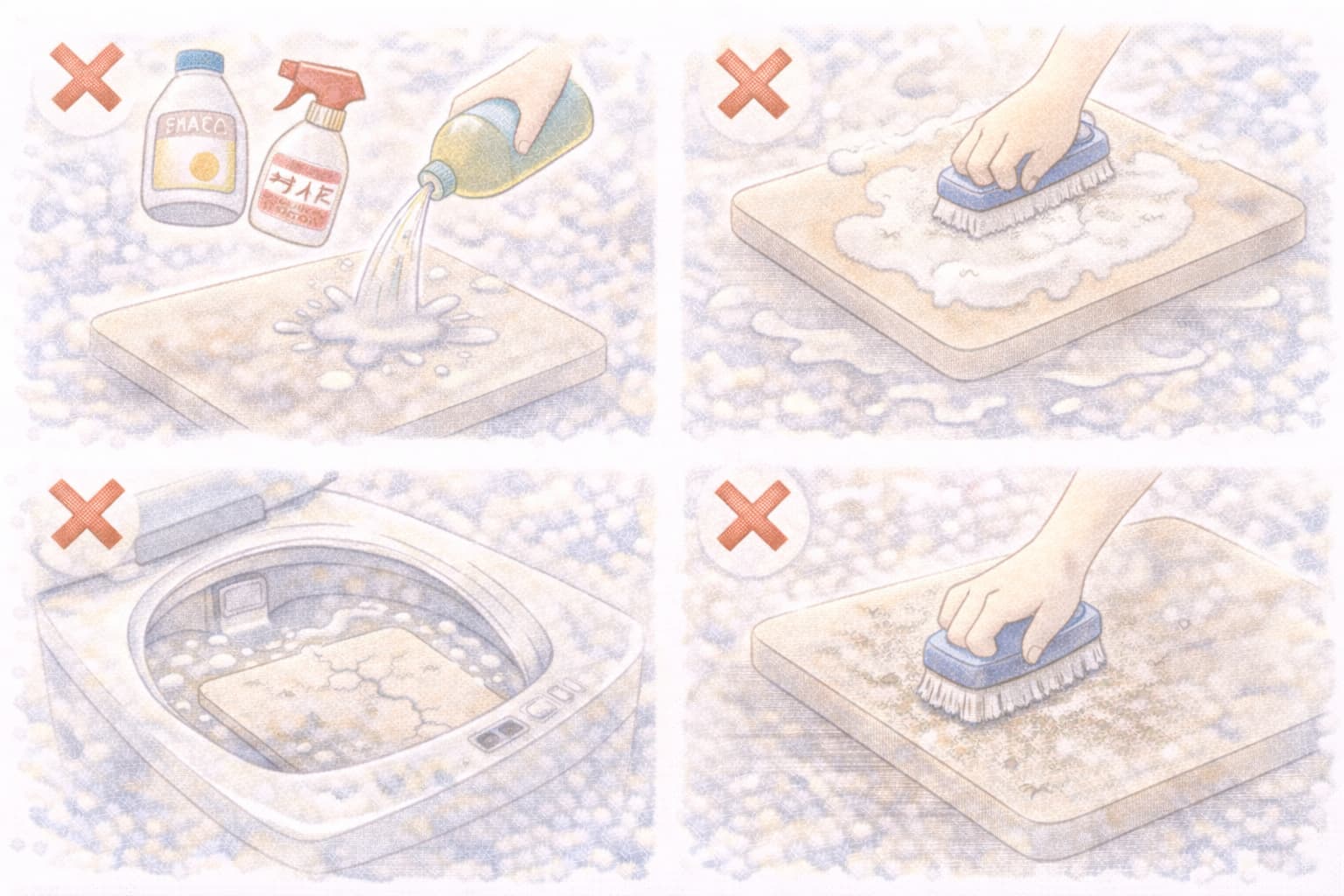 洗濯機での丸洗いや、ブラシなどで強くこする行為は、素材そのものを削ったり、内部構造を壊したりする原因になります。