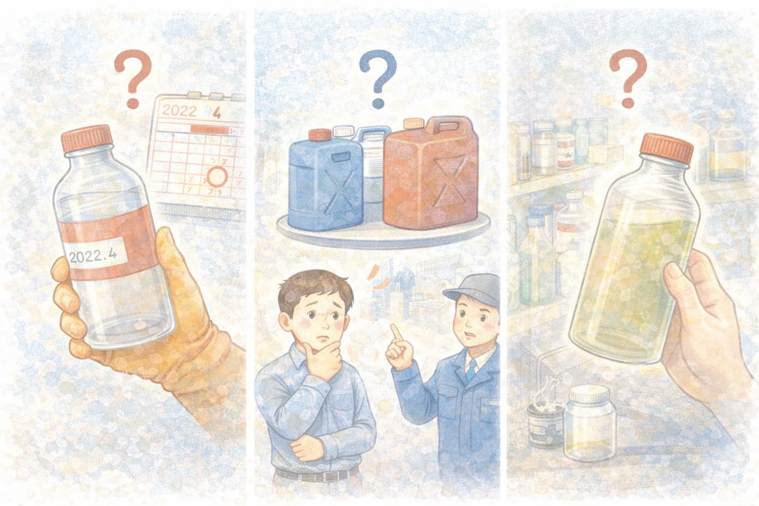 性質が不明な液体は、予期しない化学反応や有毒ガスの発生につながるリスクがあります。