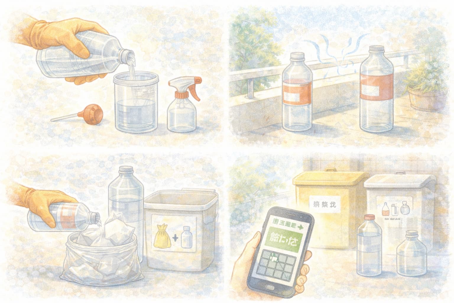 捨て方は「量」と「状態」によって変わり、少量であれば家庭内での安全な処理が可能な場合もありますが、判断に迷うときは無理をしないことが重要です。