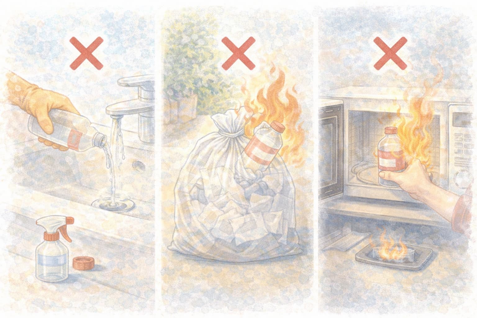 流す、燃やす、密閉するといった行為は重大な事故を招くおそれがあり、絶対に避けるべきです。