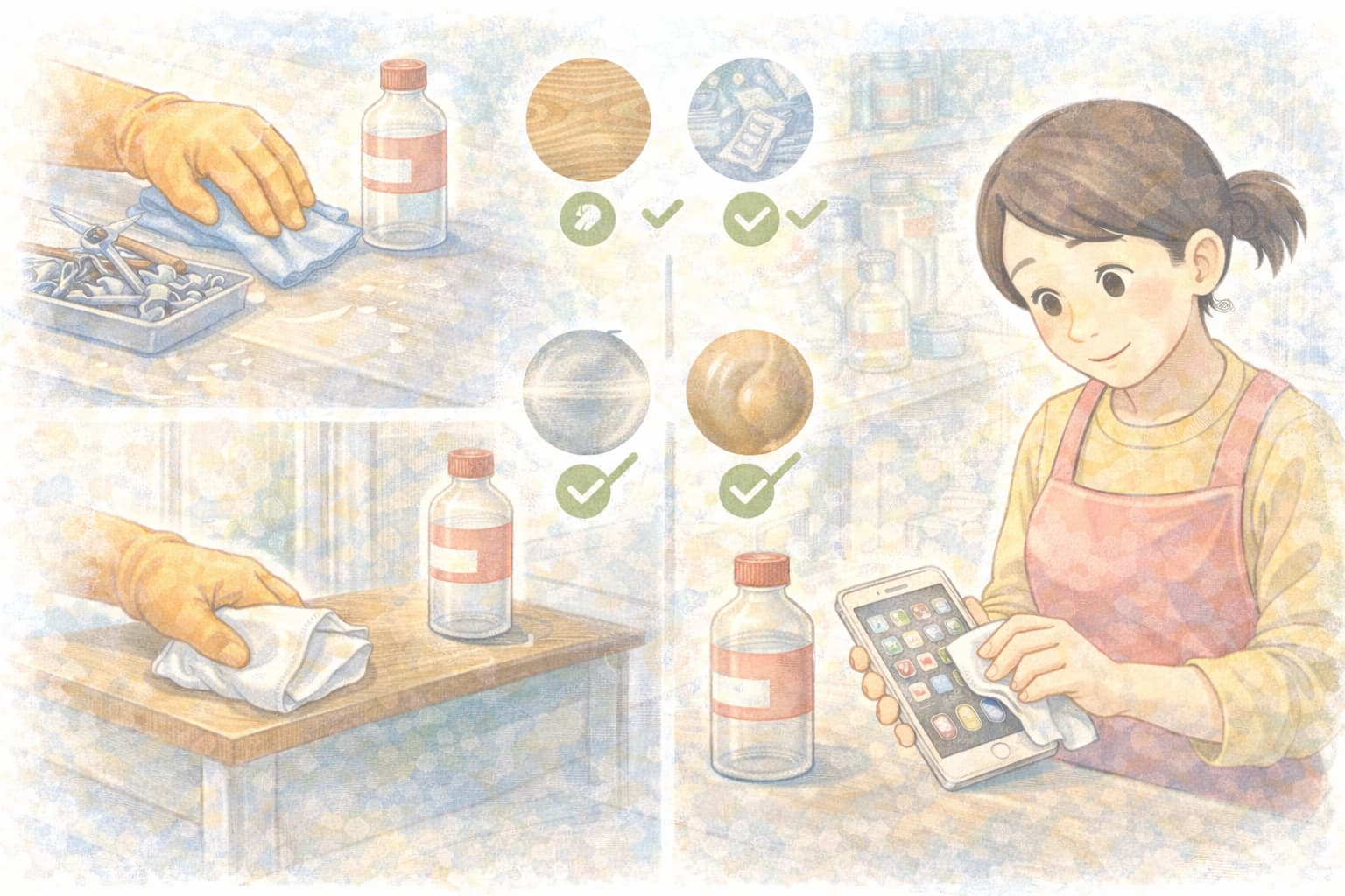 キッチン周りの軽い油汚れ、工具や金属部品の脱脂、シール跡や皮脂汚れの除去などでは、少量を布に含ませて拭き取る方法が一般的です。