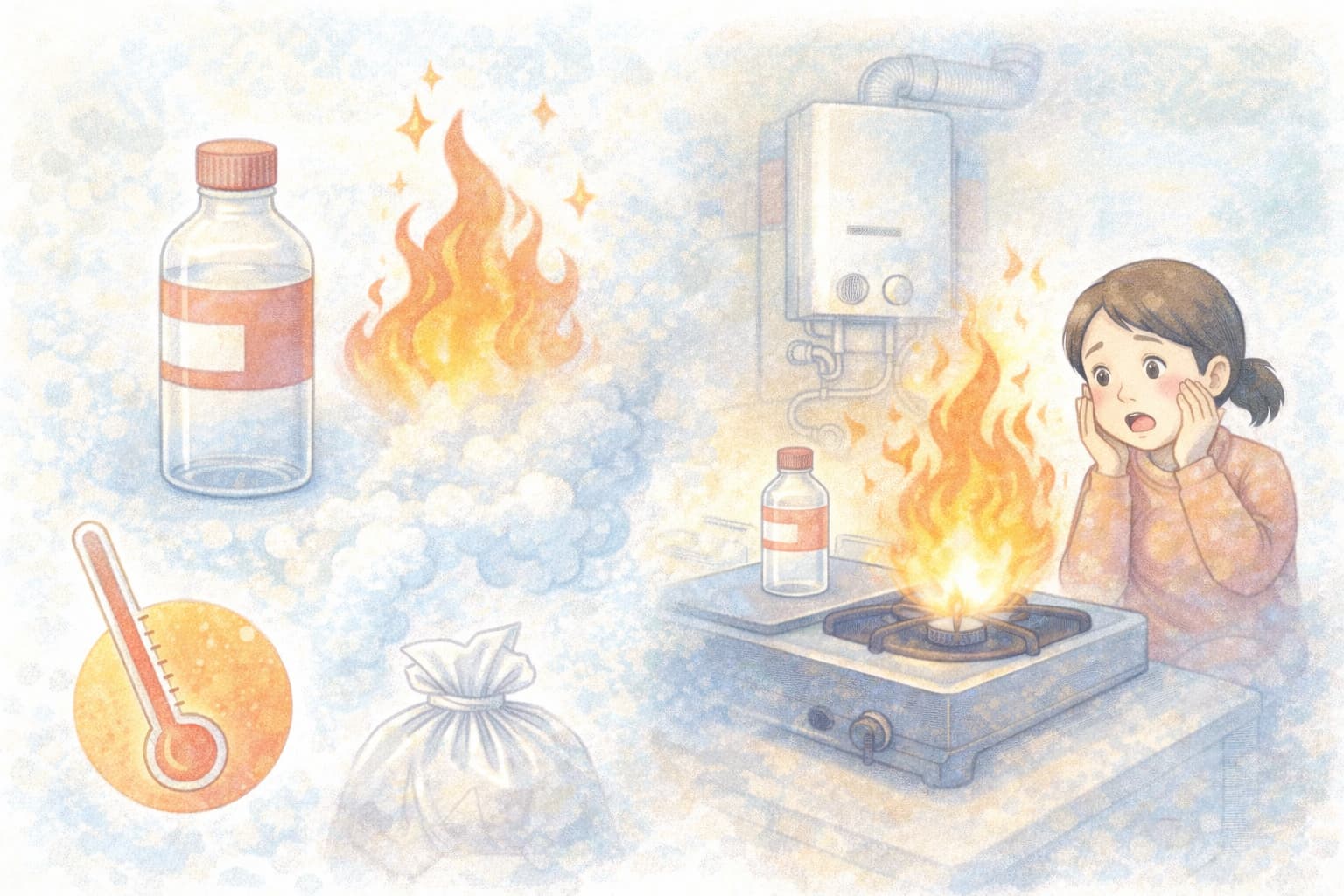 また、ストーブやコンロの近くで処理しようとした結果、蒸気に引火して事故が起きる事例もあります。