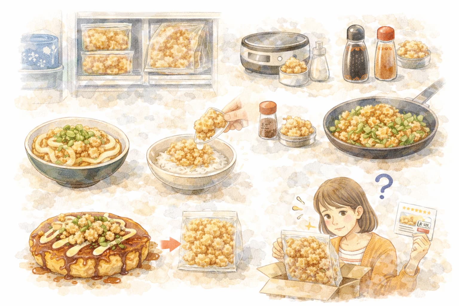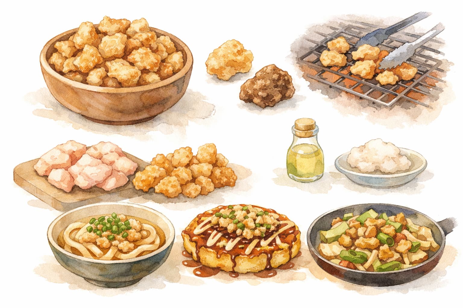 お好み焼きやたこ焼きでは、生地や具材に混ぜ込むことで、噛んだときにコクが広がり、食感のアクセントにもなります。