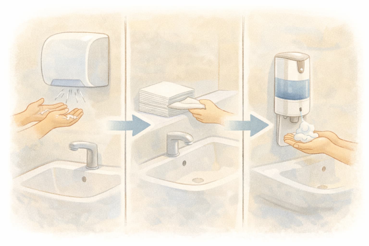 衛生面を最優先するならペーパータオルが安心ですが、コストを抑えたい場合はタオルを高頻度で交換する運用が現実的です。